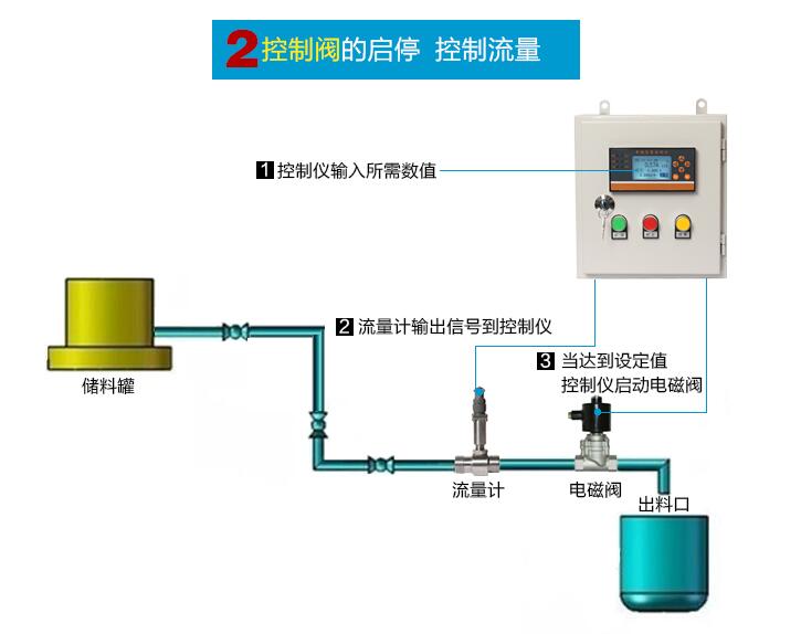 通過流量計(jì)測量流量 ,控制儀表接收信號,在控制儀表里設(shè)置定量值。定量值達(dá)到后電磁閥、水泵 斷電停止工作。