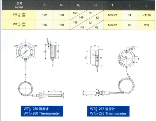 WTZ/WTQ-280/288系列壓力式溫度計該型號壓力式溫度計適用于過程中較遠(yuǎn)距離的非腐蝕性液體或氣體的測量,電接點(diǎn)型壓力式溫度計能在工作溫度達(dá)到和超過給定值時發(fā)出電訊號。
