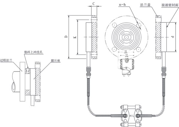 AK-3051DP雙法蘭液位變送器是一種通過安裝在管道或容器上的遠(yuǎn)傳裝置來感受被測壓力,該壓力經(jīng)毛細(xì)管內(nèi)的灌充硅油(或其它的液體)傳遞至變送器的主體,然后由變送器主體內(nèi)的δ室和放大線路板,將壓力或差壓轉(zhuǎn)換4~20mA.DC信號輸出(參見結(jié)構(gòu)原理圖)。 |